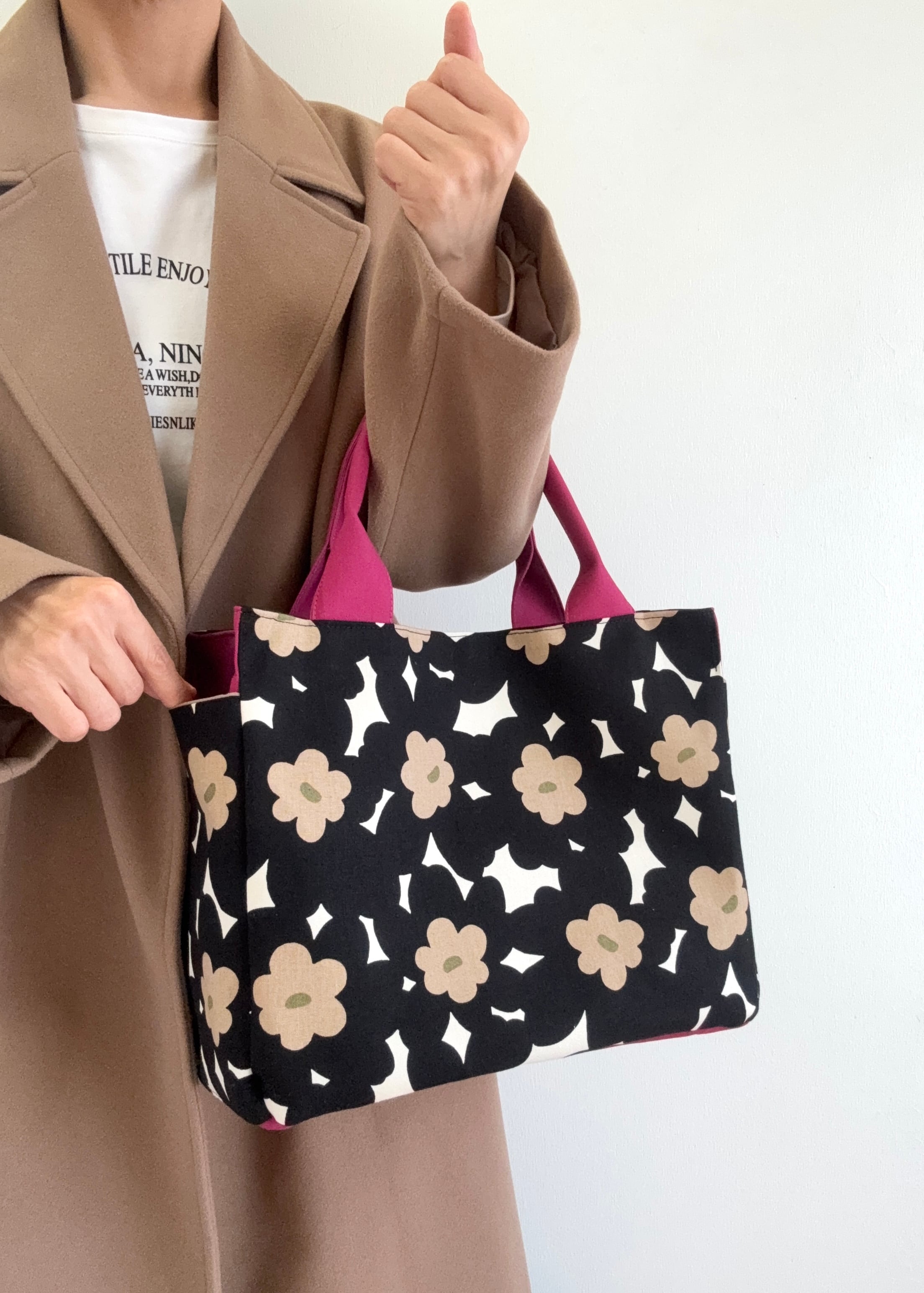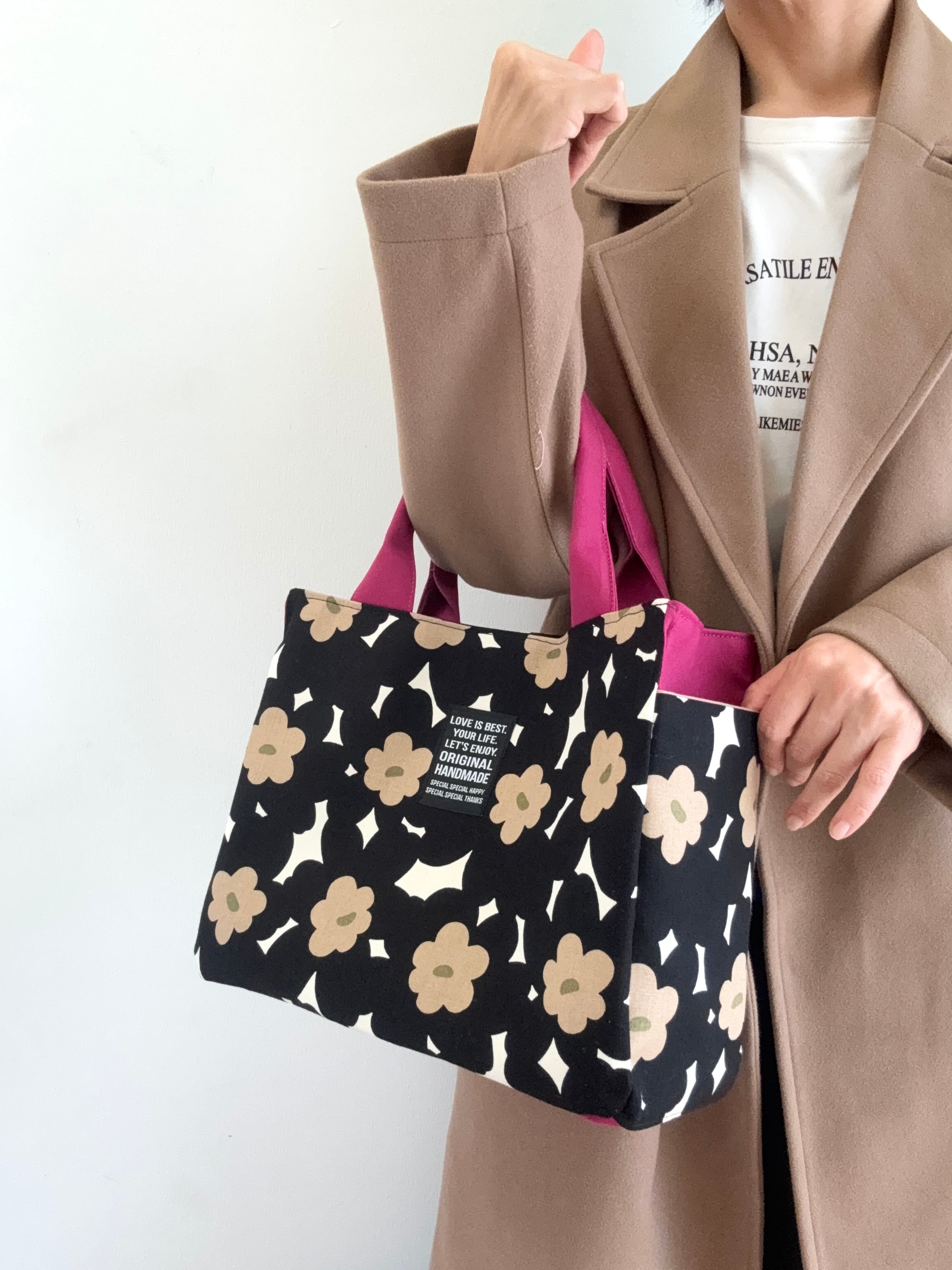 両サイドポケットトートバッグ・ブラックフラワー