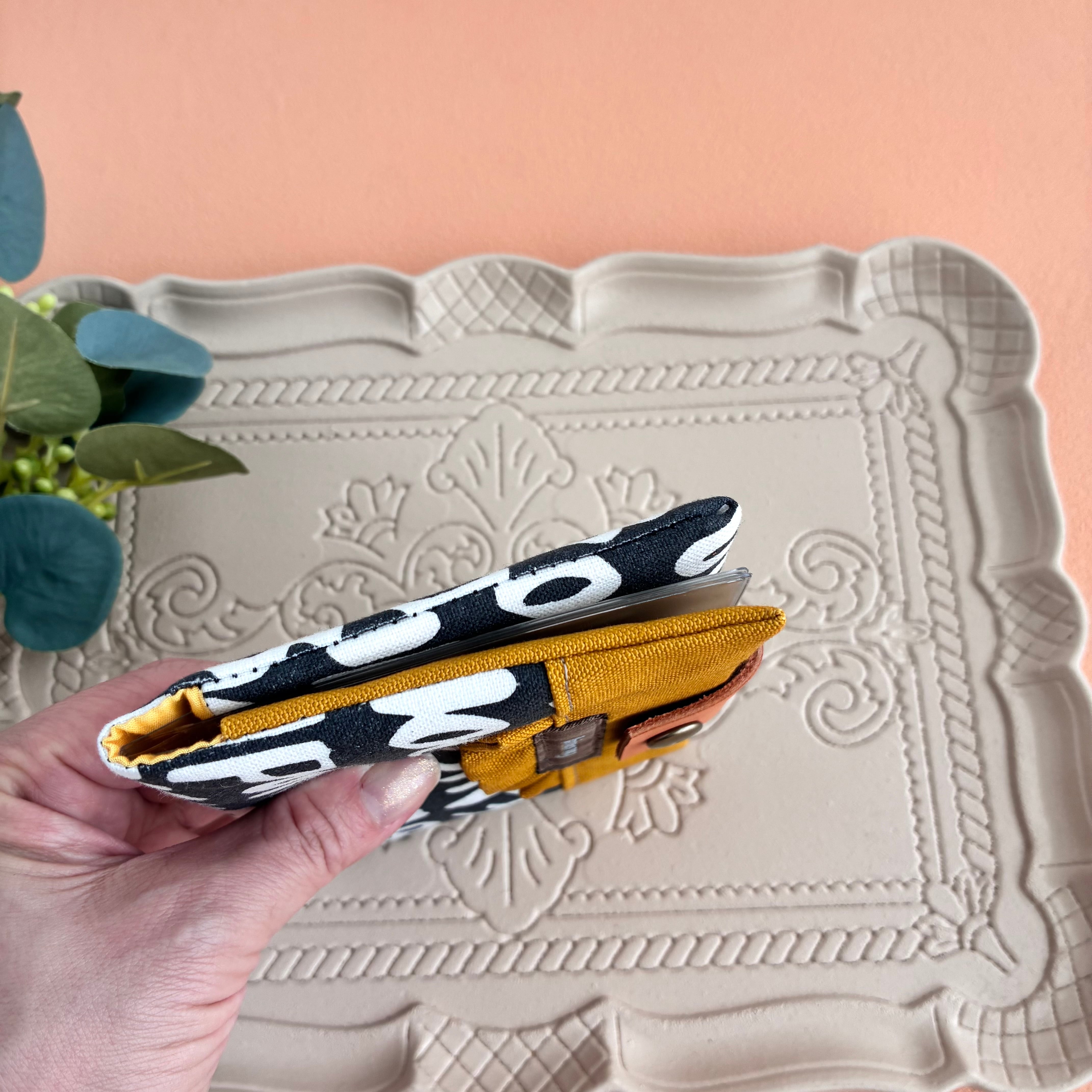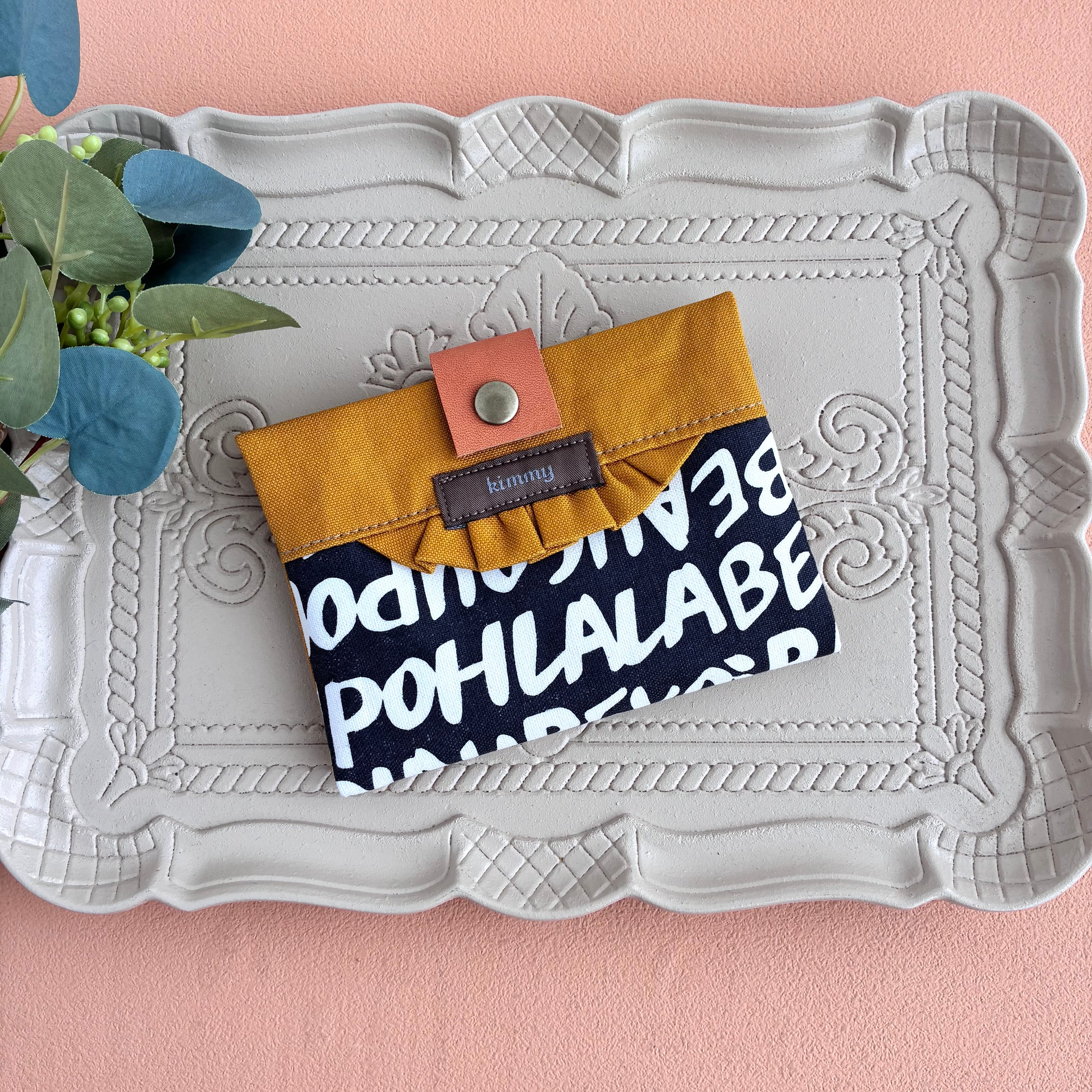 ダークグレーの英字とマスタードの組み合わせデザインです。