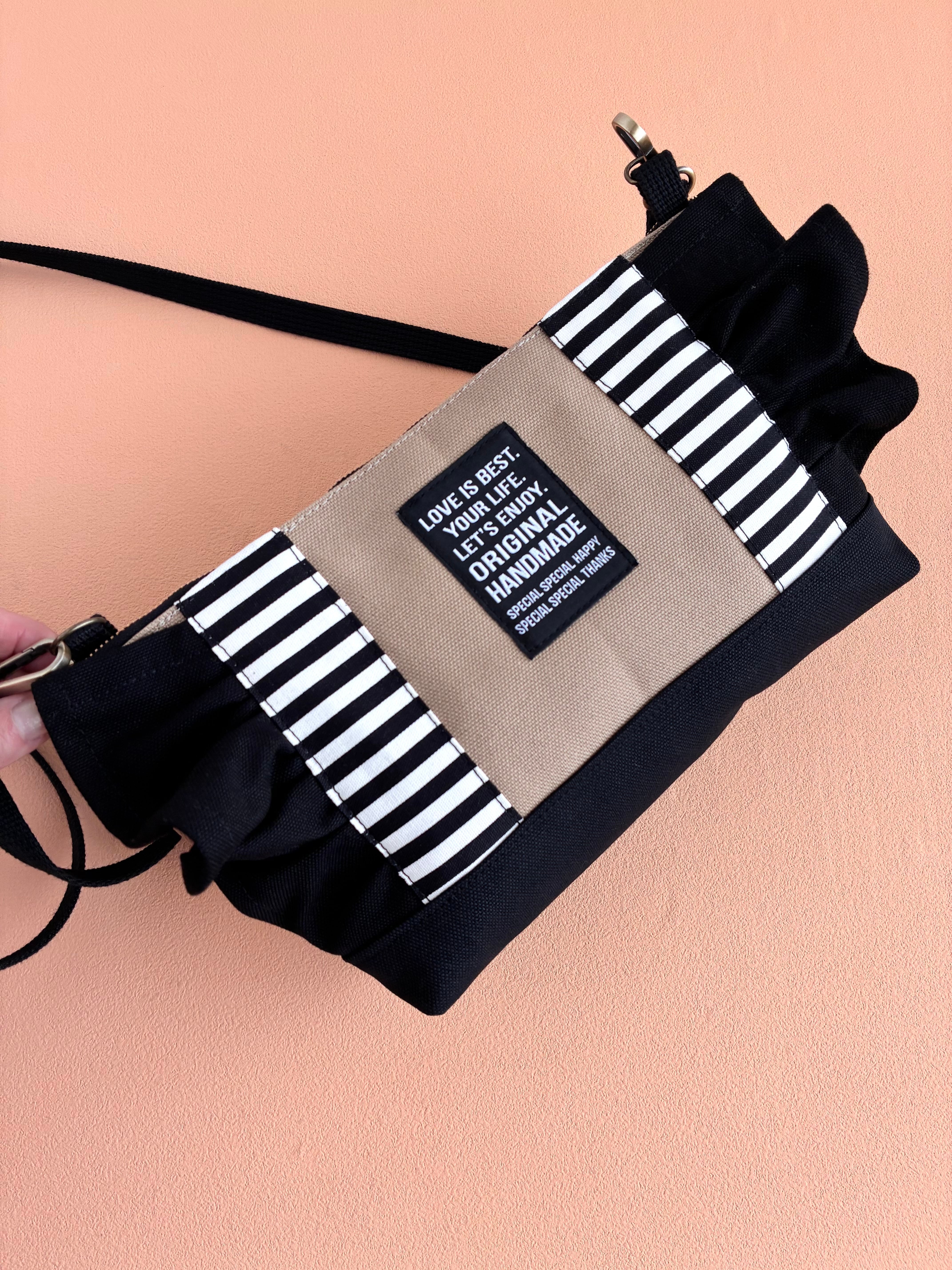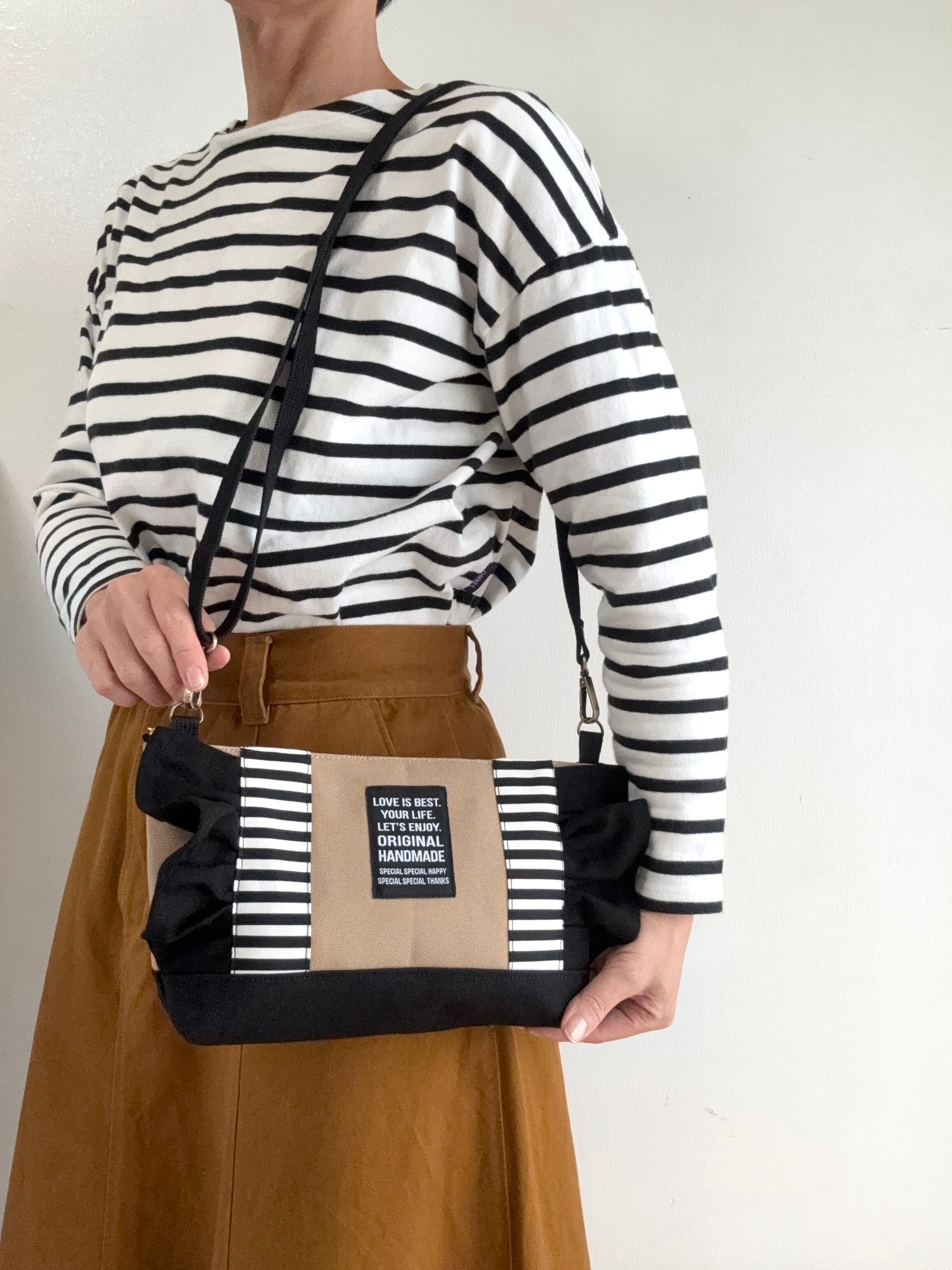 ブラックのフリルが可愛い、横長タイプのショルダーバッグです。